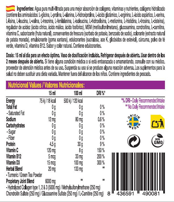 Pure multi-filtered water for best uptake of collagen, vitamins and nutrients, hydrolyzed collagen (contains the amino acids: L-glycine, L-proline, L-alanine, L-hydroxyproline, L-glutamic acid, L-arginine, L-aspartic acid, L-serine, L-lysine, L-leucine, L-valine, L-threonine, L-phenylalanine,L-isoleucine, L-hydroxylysine, L-methionine, L-histidine, L-tyrosine, L-cysteine), acidity regulator (citricacid, malic acid, phosphoric acid), msm (methylsulfonylmethane), glucosamine, chondroitin, l-carnitine, vitamin c, flavor (natural fruit), freshness preserver (potassium sorbate, sodium benzoate), color (natural purple potato extract), emulsifier (xanthan gum), sweetener (sucralose, ace k, steviol glycosides), turmeric, green tea powder, vitamin D, vitamin B12. Natural Flavor and Color. Contains sweetener.